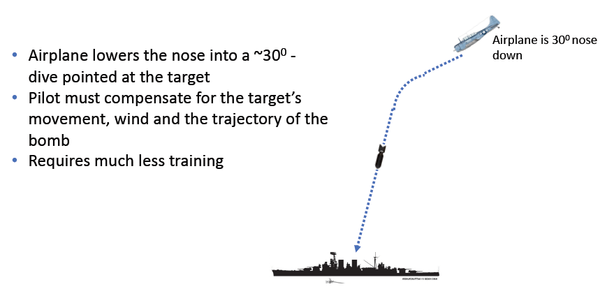 In this form of attack, the pilot rolls the airplane into a steep turn abeam of the target and pushes the nose almost straight down, so it is 70 to 80 degrees below the horizon. When the bomb is released, it follows the trajectory of the airplane, after which the pilot pulls back on the stick, retracts the dive brakes and makes a three to four G (or more) pull out.